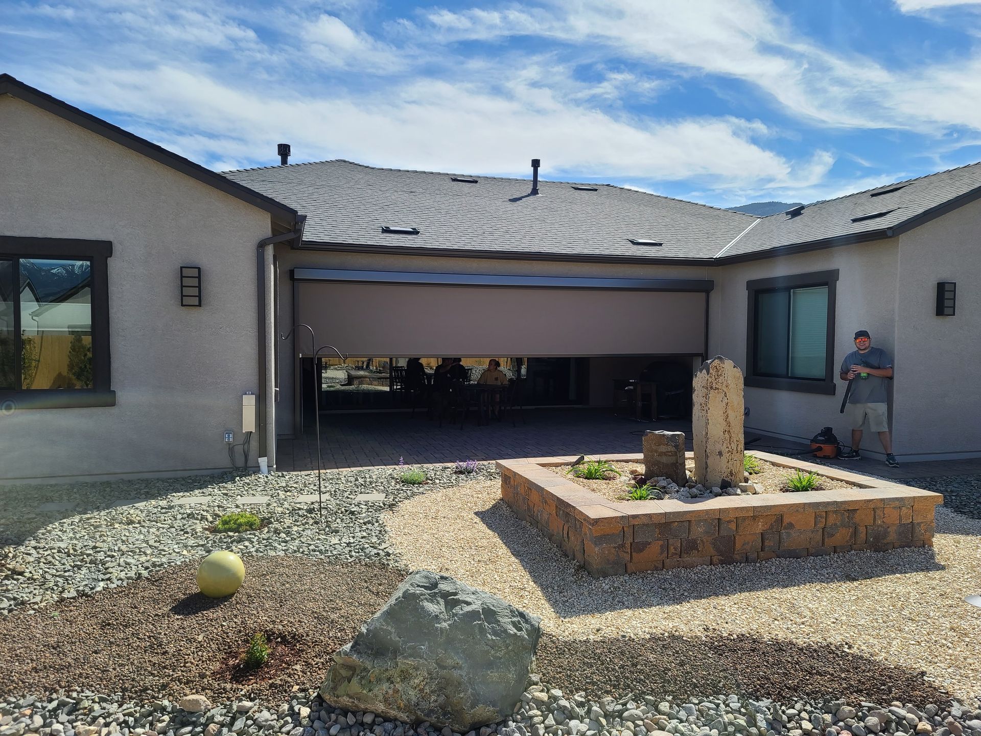 "Installed a covered patio area last summer and although it really helped us during the day with protection from the strong Nevada sun, we quickly realized that late afternoon and going into the sunset, the sun was so strong we weren’t able to use our patio area. Ernie from Sierra Shading had the solution with a solar shade that spanned our entire covered area. We now can spend our late afternoon and early evening outside to enjoy the views. Not only has to given us the relieve from the sun, the late afternoon heat is reduced, both outside and into our family room.